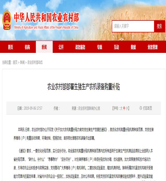 農業(yè)農村部辦公廳日(rì)前印發《關於(yú)加大農機購置補貼力度支持生豬生產(chǎn)發展的通知》,就優化農機購置補(bǔ)貼機具種類範圍,支持(chí)生豬養殖場(戶)購置(zhì)自動飼(sì)喂、環境控製(zhì)、疫病防控、廢棄